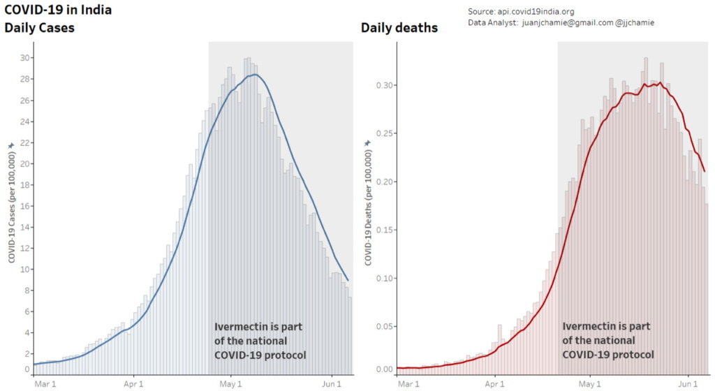 Ces deux courbes montrent l'évolution du nombre de cas et décès après la décision de préconiser l'Ivermectine dans le cadre du protocole de lutte contre le COVID19 en Inde. Relation de cause à effet ou coïncidence ?